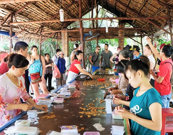 11h30: Tiếp tục thuyền máy đưa đoàn đến nhà hàng sinh thái dùng cơm trưa với đặc sản Nam Bộ: Cá Tai Tượng Chiên Xù cuốn bánh tráng chấm mắm nêm.